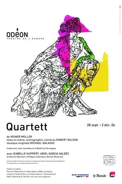 Ο μάγος της εικόνας Robert Wilson (Pόμπερτ Γουίλσον) επαναπροσεγγίζει, μετά από μία εικοσαετία, το μυλλερικό Κουαρτέτο. Συμπυκνώνοντας σε είκοσι περίπου σελίδες το επιστολογραφικό μυθιστόρημα του Λακλό, ο Xάινερ Μύλλερ γράφει ένα διαλογικό επεισόδιο για τον πόλεμο των φύλων και την «υποκριτική τέχνη των θηρίων», για το ερωτικό πένθος και τη θρυμματισμένη αστική συνείδηση, με μιαν απαράμιλλη γλώσσα ειρωνείας και σκληρότητας, ενώ οι συνεχείς εναλλαγές ρόλων, φύλων και ταυτοτήτων αποτελούν τη μεγάλη πρόκληση για τους ηθοποιούς. Αυτή τη φορά, ο Γουίλσον καλεί στην υποκριτική αρένα τη σπουδαία Ιζαμπέλ Υπέρ, στο ρόλο της μαρκησίας ντε Μερτέιγ, απέναντι στον Αριέλ Γκαρσία Βαλντέζ, που ερμηνεύει τον Βαλμόν.